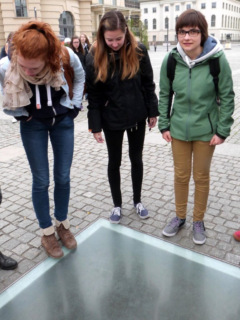 Op 10 mei 1933 hadden de nazi’s er 25.000 boeken verband, vooral van Joodse schrijvers en van ‘vijanden’ van het Hitlerregime. Ook Heines boeken. Hij was een gedoopte Jood. Ook de werken van regimecriticus Erich Kästner werden verbrand. Hij was daar, hij zag het.