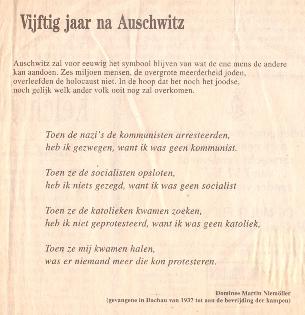 Martin Niemöller (1892-1984) was een Duits, luthers theoloog, die deelnam aan WO 1. Hij verzette zich tegen Hitler en na een preek van hem in 1937 werd hij gearresteerd en naar Sachsenhausen en daarna naar Dachau overgebracht. Zeven jaar zat hij vast.