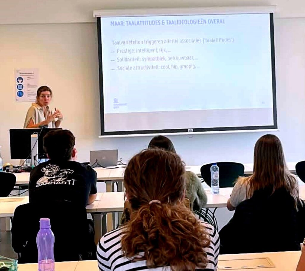 Tweede workshop, prof Chloe Lybaert (Nederlands taalkunde – Nederlands als tweede taal), les over taalvariatie met titel ‘een accent is niet zomaar een accent’